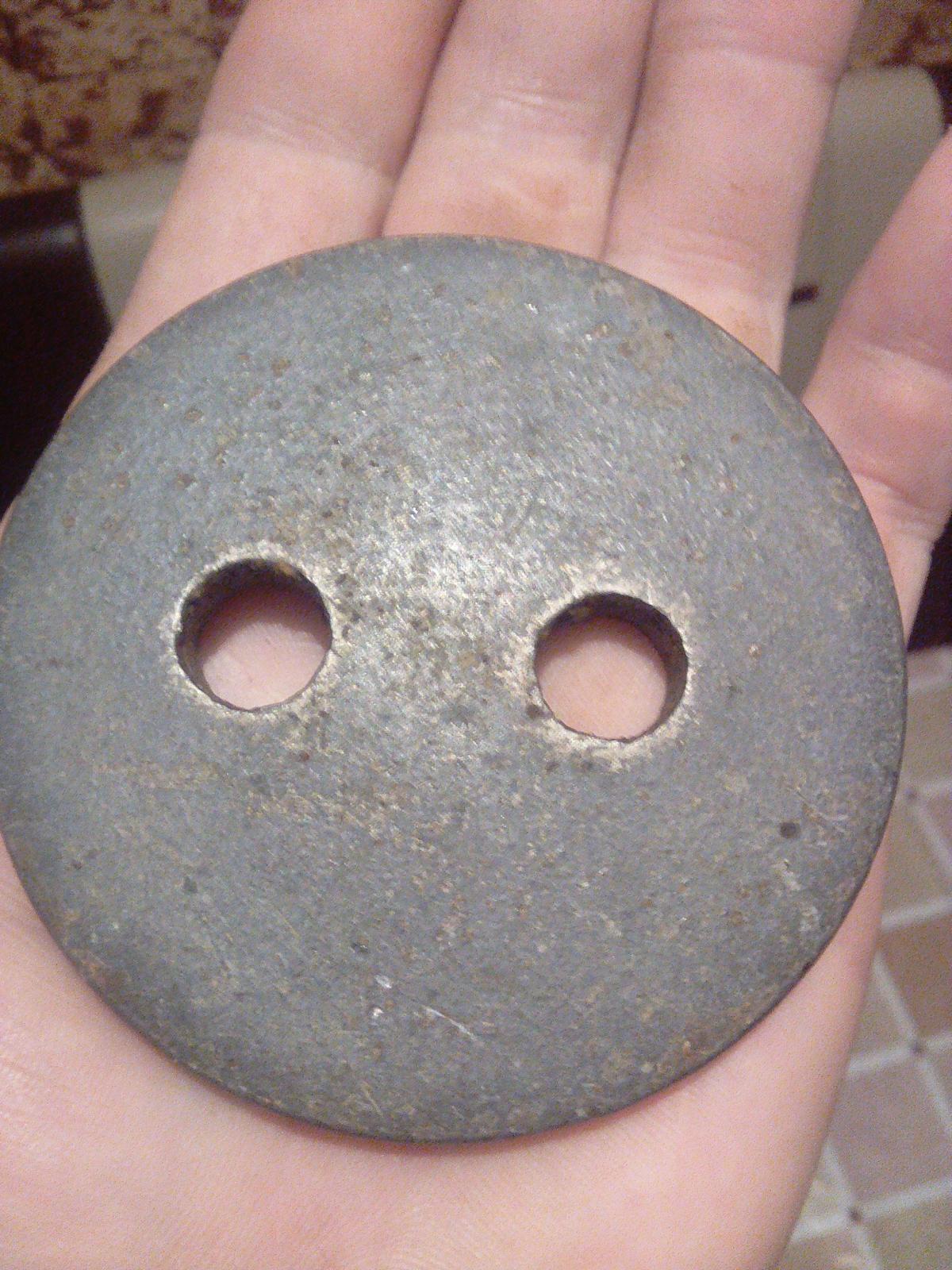Это НЕ пуговица. Не все что с двумя отверстиями, круглое и плоское - пуговица... В тренажерный зал зайдите там таких пуговиц не мерено...