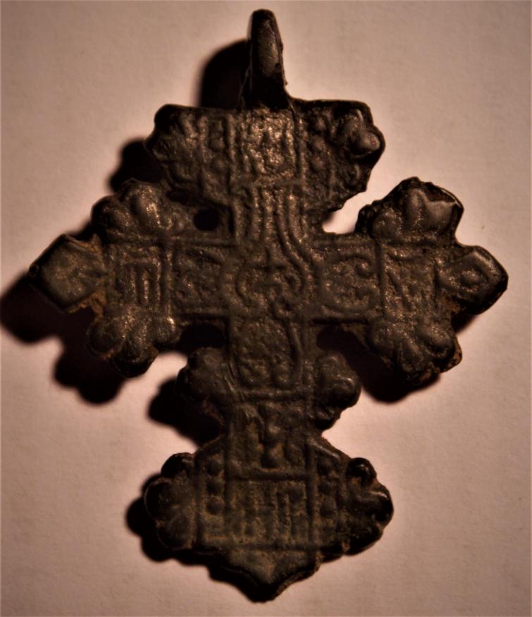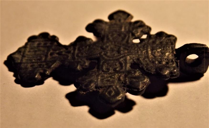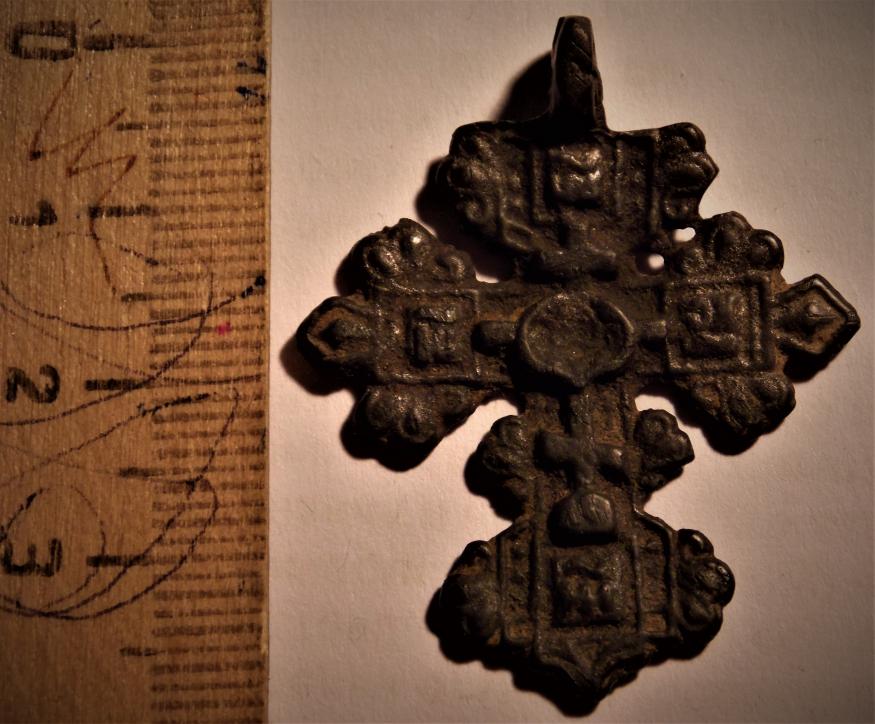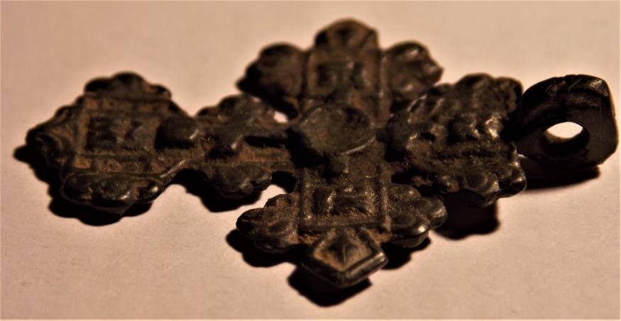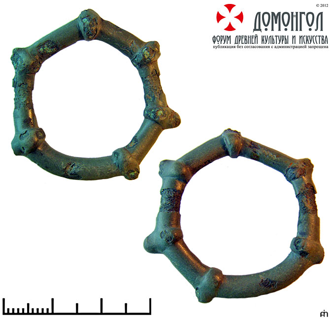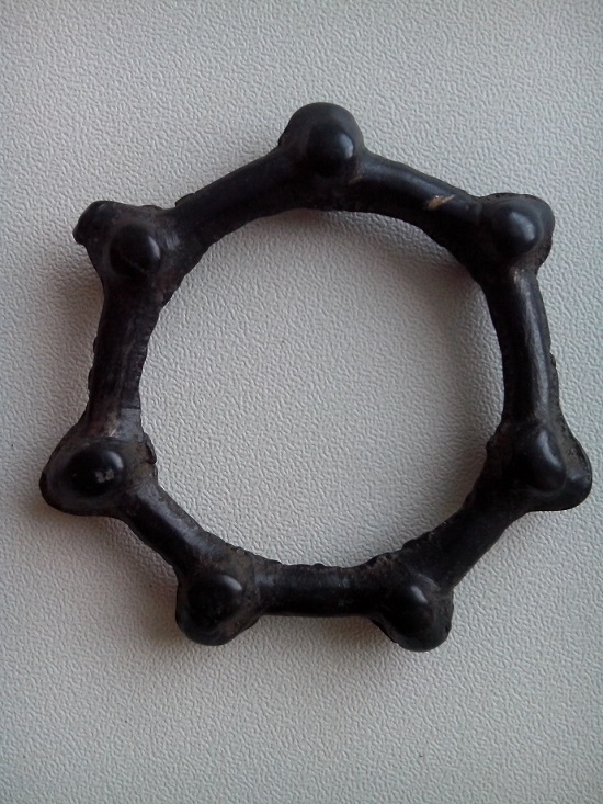 Добрый вечер. Во нашлась такая находка. Сначала подумал конина. Потом нет. Зачем тогда тако выпендреж. Шесть шышок на кружке. С одной стороны полукруглая, с другой стороны плоская. Зачем так заморачиватьс? Металл бронза.