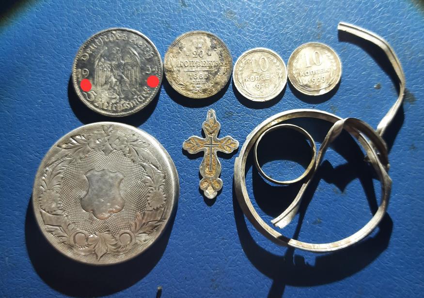 Здравствуйте, Михаил! Отличные находки! Интересно, что это за дама? У нее слуховая трубка? Я тоже не выдержал, перед заходом солнца бросил домашние дела и сходил на полчаса возле окраины сосняка. Нашел пять монеток и как всегда по войне цветмет.
