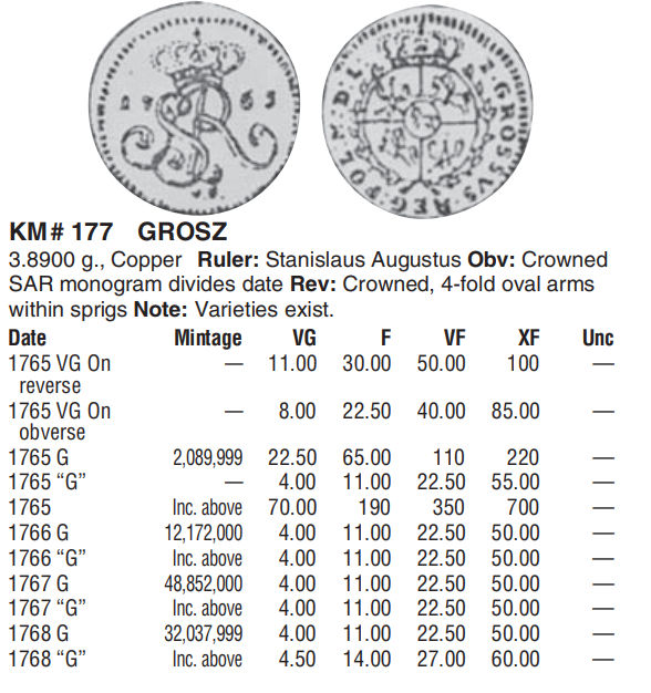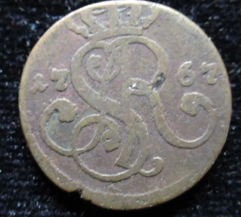 Это грош Речи Посполитой 1767 года выпуска. Правитель - король Польши и великий князь Литовский Станислав Август (1764-1795 гг.). Номер по Краузе - КМ#177.