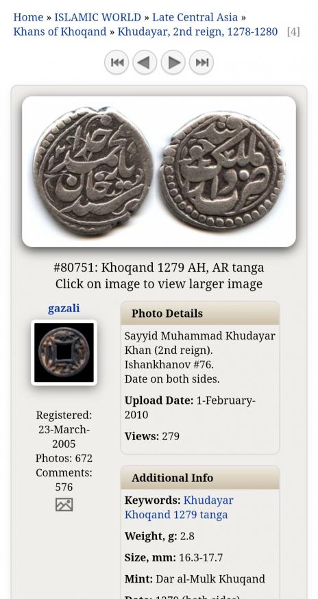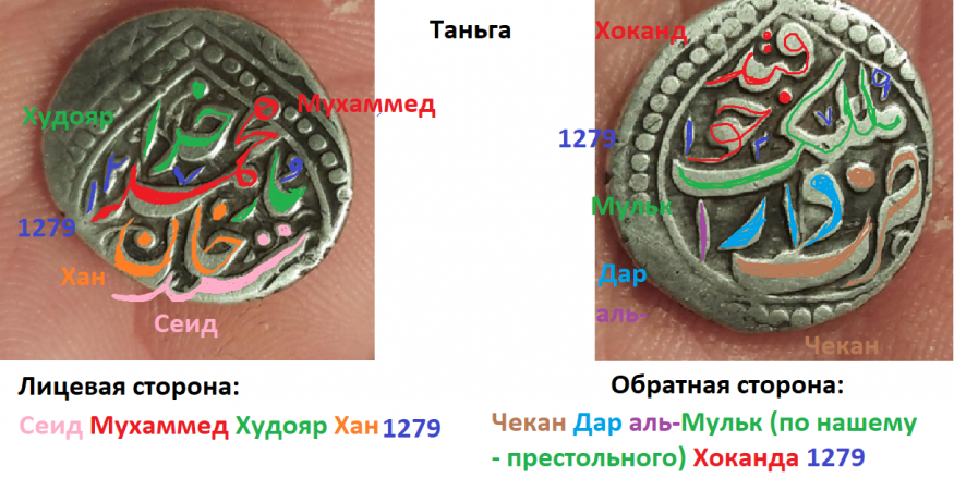Это один из самых красивых выпусков среднеазиатских ханств 19-го века. Так и хочется разрисовать ее переводом. Худояр правил три раза, причем второе правление было самым коротким - пару лет. Поэтому может этот тип таньги не очень частый и стоит даже дороже, чем я думаю. Надо посмотреть последние проходы этой таньги на больших ауках.