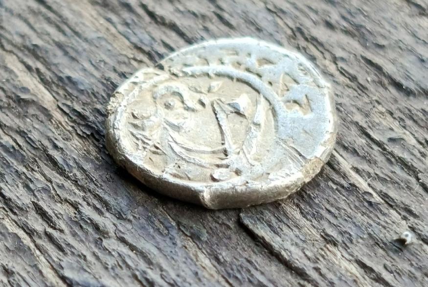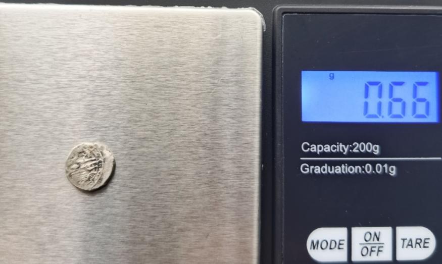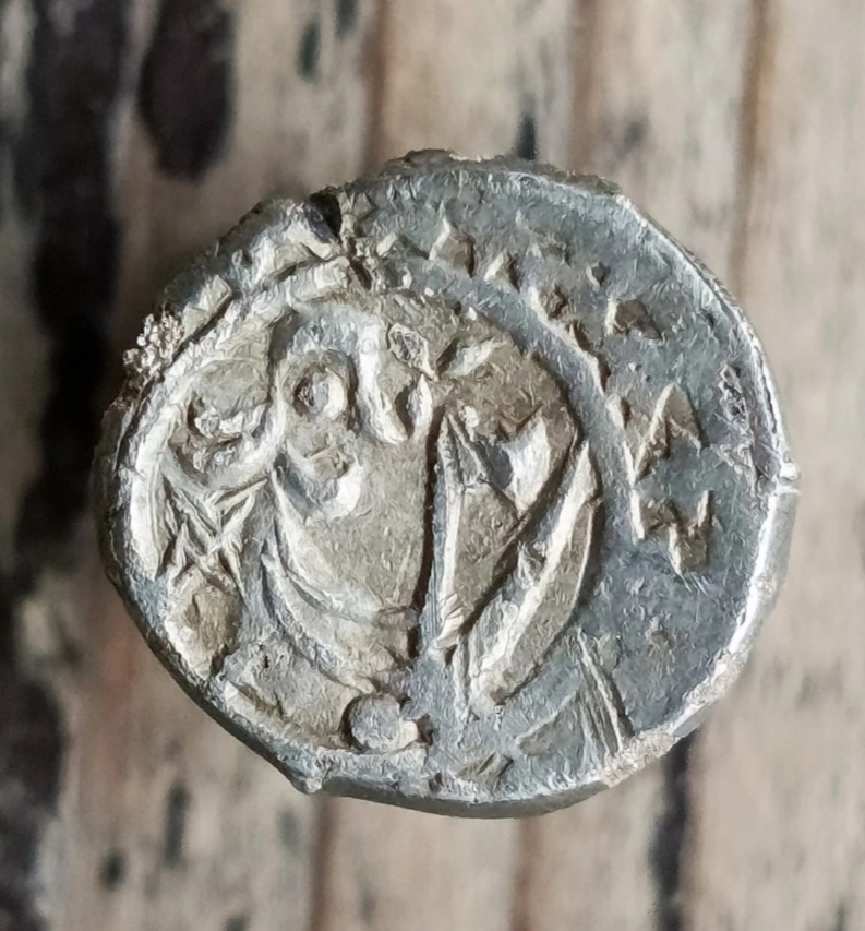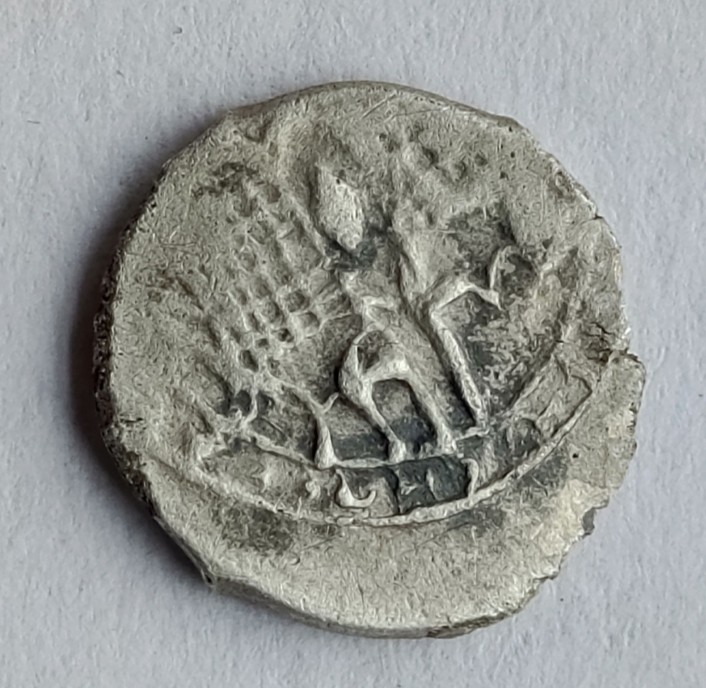 Ярославское княжество. Анонимная чеканка. Денга 1412-1420 гг. Серебро. Аверс: воин с мечом и топором вправо, плетенка за воином, трилистник под топором, круговая псевдолегенда. Реверс: подражание. Два крупных квадрата с частой прямой штриховкой вокруг псевдолегенда. ГП2 4337В Редкость - V.