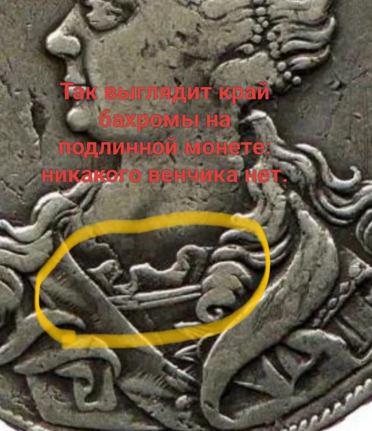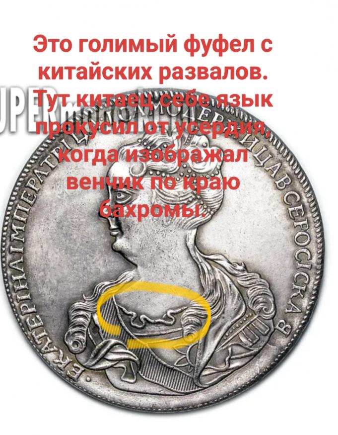 Браво, Артём! Присмотрелся, а это реально голимый фуфел с китайских развалов. Вот подчеркнул венчик по краю бахромы на вырезе платья, его быть не должно. Для сравнения показываю такой же венчик на фуфеле из магазина фуфелов и еще показываю как выглядит край выреза платья на подлинной монете.Не могу оценить, так как не уверен в подлинности монеты. Нет четких фото, на поле ни одной слойки нет. Общий фон размыт.