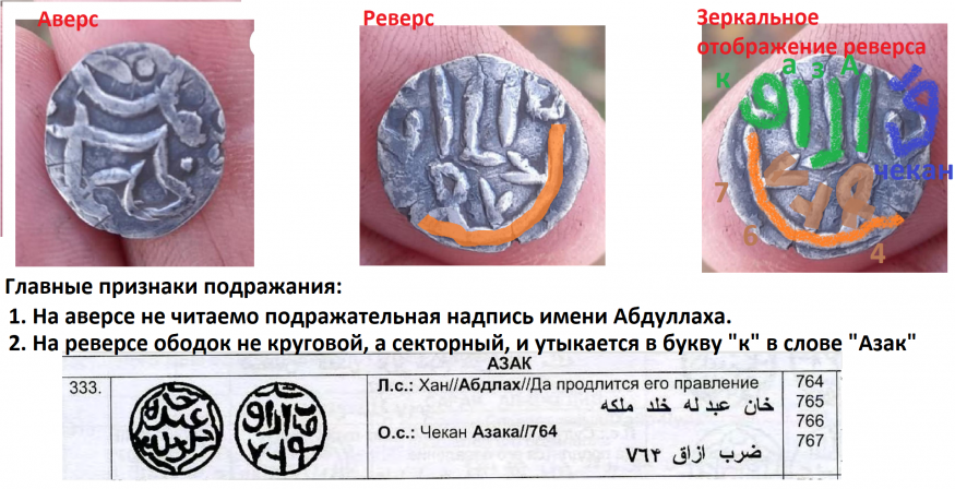 На рисунке перечислены доводы, обличающие подражание. Еще добавлю, что отзеркалить на штемпеле наименование монетного двора для официального резчика недопустимо и никогда на подлинных монетах Азака не наблюдалось.