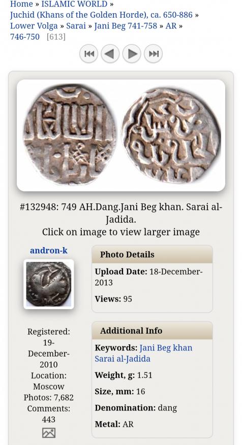 Добрый день, Василий. Это дирхем выпуска 749 гх. В базе Зено есть монета такого типа под номером 132948.
