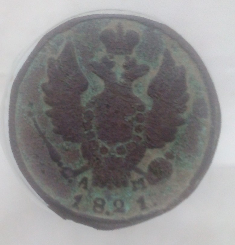 Здравствуйте.1 копейка 1821 год. Выкопал,не чистил только помыл водой. Прошу Вас оценить данную монету. Заранее благодарен. С Уважением,....