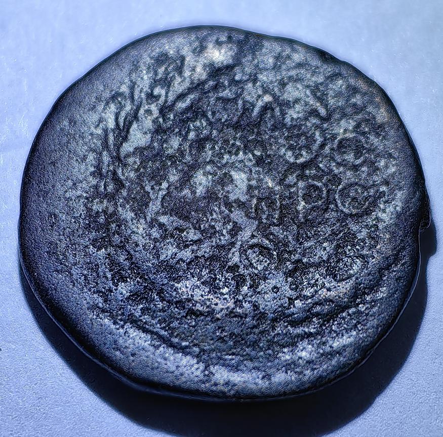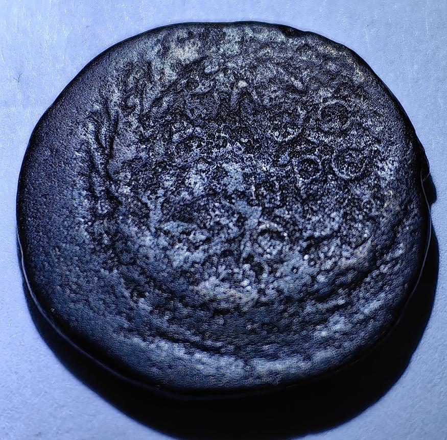 Когда мы видим римскую монету, то считаем логичным что легенды на ней будут написаны на латыни. Здесь же на аверсе мы видим венок, в котором в четыре строки кругляшами и округлёнными символами что-то написано. Среди алфавитов античных народов, находившихся под влиянием Римской империи, такого алфавита с такими буквами я не нашел. Поэтому считаю логичным что перед нами варварское подражание римской монете, штемпельную пару для которого изготовил неграмотный резчик. По монетам Рима есть интересная книга Гарольда Мэттингли с каталогом. Из этого каталога более всего на нашу монету похож асс Антонина Пия - первые десятилетия, 147-148 годы выпуска. Таблица 37, монета №9. Подлинный асс мог весить от 8 до 12 граммов. Вес варварского подражания обычно ниже копируемого оригинала. Возможно я ошибаюсь, если так, то хотел бы узнать версии коллег.