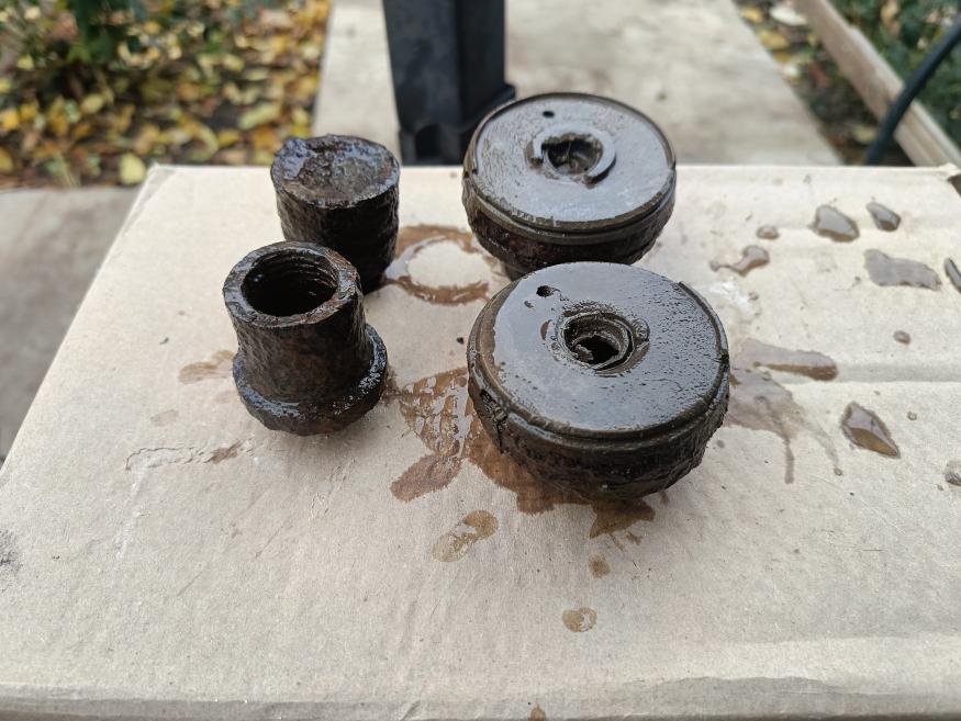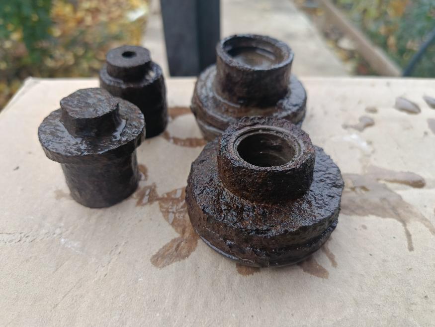 В полях часто попадаются такие конструкции. Они имеют форму под рожковый ключ, внутри у них резьба, посредством которой их накручивали на что-то, и некоторые из них имеют отверстие в торце, какбы под взрыватель. Все мои находки разных размеров, но имеют сходную конструкцию, а значит общее назначение. Нашел у себя в металлоломе четыре штуки чтобы показать. Но находил их больше. Кто что знает про эти штуки? На тракторах таких вроде не видал. На БМП тоже такого не было...