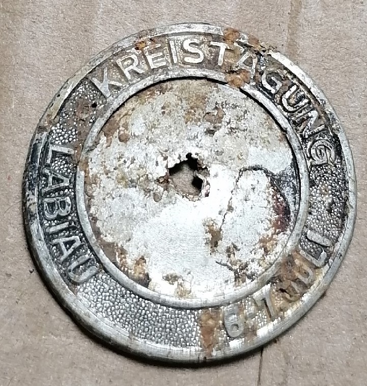 Здравствуйте, Уважаемые знатоки фалеристики! Помогите, пожалуйста, разобраться с этим знаком. Конечно, значок пострадавший, выкопан в Калининградской обл., но интересен с точки зрения истории. На значке надпись kreistagung labiau 6-7 Juli . Labiau - сейчас город Полесск в Калининградской обл., kreistagung переводится как окружное собрание или районная конференция и дата на значке - 6 - 7 июля. Т.е. значок был выпущен до Второй Мировой войны, возможно принадлежал какому то депутату какой то конференции? Может кто подскажет более подробную и конкретную информацию, так как в инете ничего не нарыл, к сожалению.