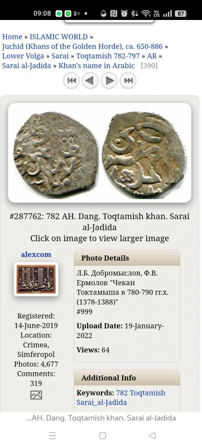 Так, так), здравствуйте Анатолий, уже читаю более полное и интересное описание, всё-таки Токтамыш отдельно, кольца отдельно ).Обычно аверс и реверс разных правителей можно встретить на русских подражаниях. Но тут реверс Токтамыша самый что ни на есть подлинный каталожный. То есть эта монета не подражание. Надо сравнить аверс с монетами мири Тимура и Махмуда. Когда Тимур гонял Токтамыша как зайца по Золотой Орде, он по дороге брал и раззорял татарские города. Возможно, когда был захвачен Сарай ал-Джедид, таджики Тимура для прикола изготовили мири с именами Тимура и Махмуда с одной стороны и захваченным в качестве трофея штемпелем Сарая ал-Джедид 782 г. х. с другой стороны? Но это пока так себе версия, пока в каталогах не обнаружен штемпель аверса.