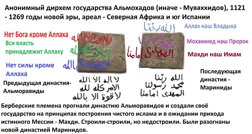 Альмохады поднялись на том, что они исповедовали единобожие и ждали прихода Мессии, следующего верным путём, по ихнему это Махди. Их идеология проецировалась и на монеты. Только Аллах имеет значение, а не человек-правитель. Надписи у них специфические, поэтому сделаю рисунок , если интересно узнать, что там написано.
