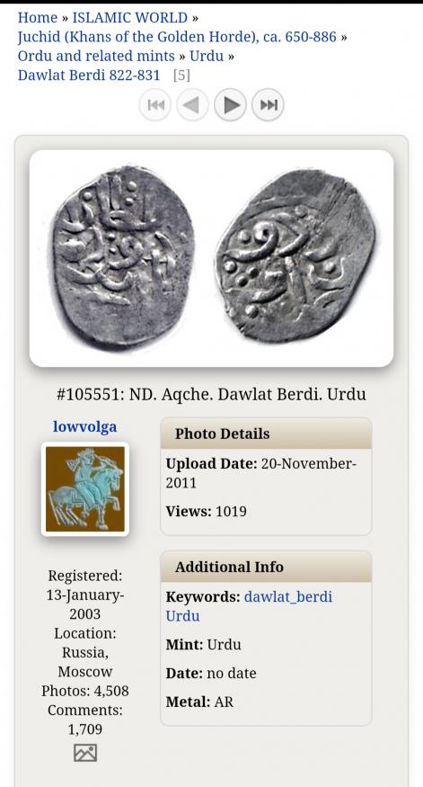 Акче Даулет-Берди, чекан Орды, без года выпуска. Номер в базе Зено #105551. В каталоге у Сагдеевой такой тип отсутствует. Это тот хан правил в 824-831 г.х.