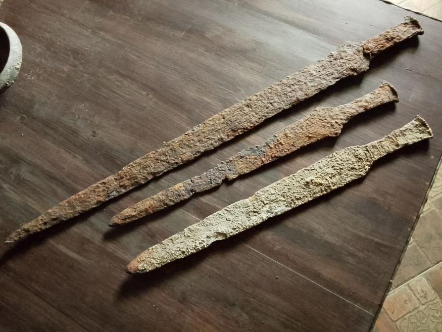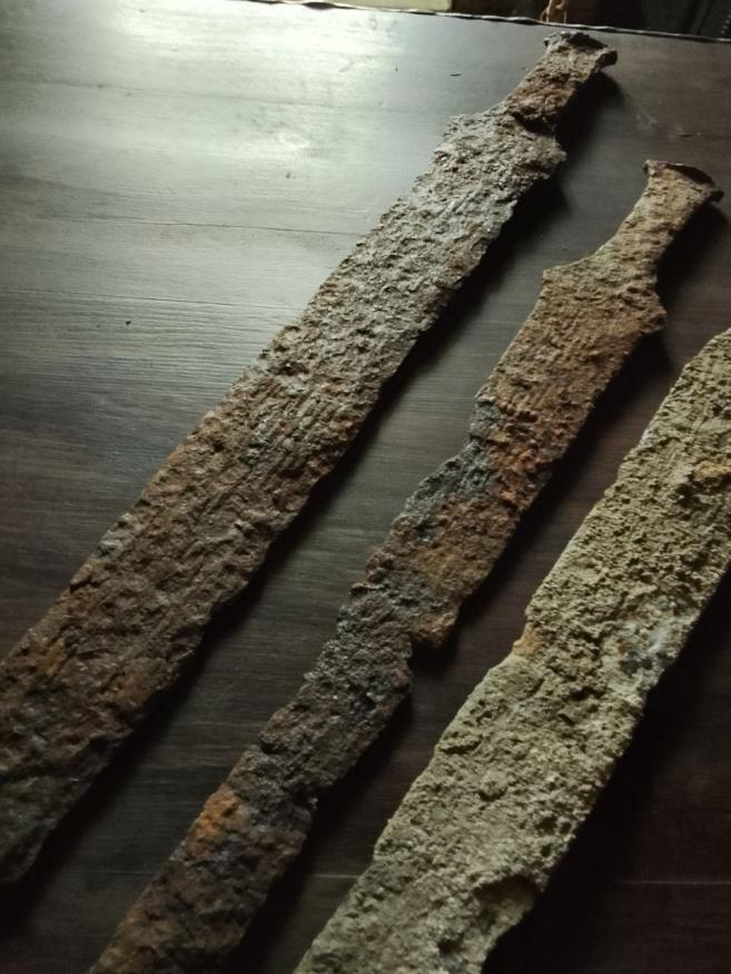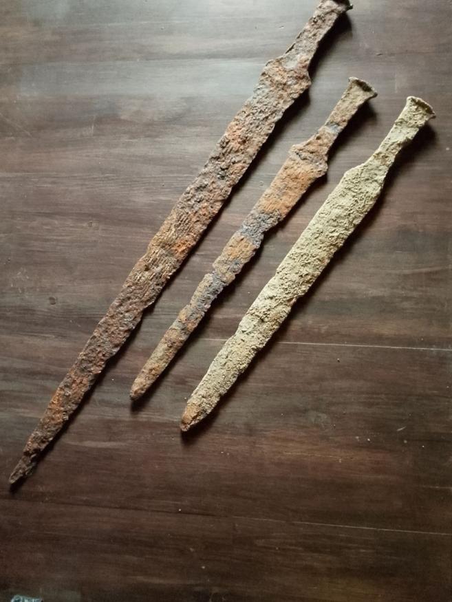 Здравствуйте, Уважаемые коллеги и коллекционеры! Есть три вот таких меча, это по всей видимости уже не акинаки, так как отсутствует характерное для скифского акинака перекрестье и навершие. Мечи однотипные, но разные по размеру, большой 75 см, маленькие по 47 см. Если присмотреться, то под слоем налета вдоль всех трех клинков прослеживаются по всей плоскости клинков полосы? Как вы думаете, что это может быть? ДОЛЫ? Или часть какого то рисунка? И кому принадлежали данные мечи? Найдены в Белгородской обл. Спасибо!