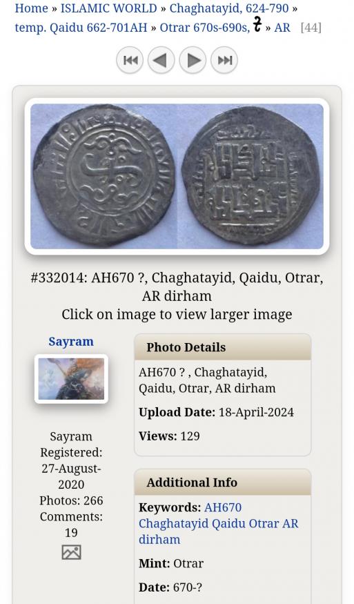 Это дирхем Чагатайского улуса, чекан Отрара 760-х годов хиджры. Правитель - Кайду хан, сын Кашина, внук Удэгэя, правнук Чингисхана. Известен как полководец. Если бы не его активная жизненная позиция в борьбе с врагами, то монгольский народ сейчас был бы многочисленнее китайского народа. В базе Зено много монет этого типа, в том числе дирхем под номером 332014.