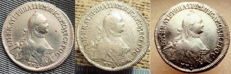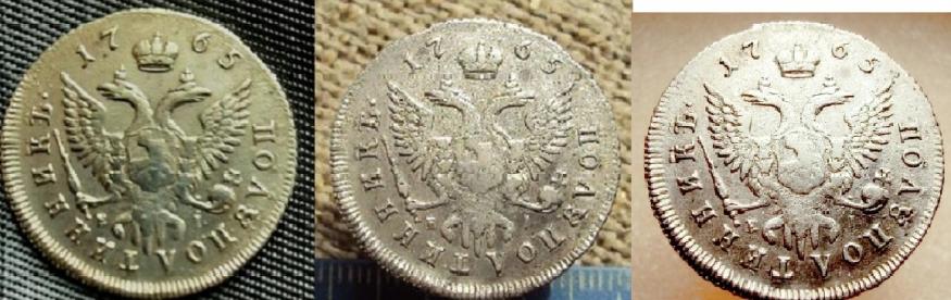 "Но ... нашёл другие полуполтинники 1765 г, не имеющие никакого отношения к монетам ТС . Естественно, все продавались как оригиналы по разной цене Правый - 17 т. руб. Два других на торгах с начальной ценой 10 т. руб. Это клоны или одна и таже монета, снятая при других условиях, судить не буду. Решайте сами."