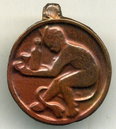 Бес с хвостом и копытами на блюде подносит бутылку и стакан. Обидно было алкашам получать такую медаль. Ни один алкаш не признает себя алкашом.