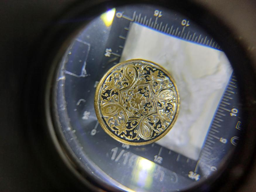 Очень похожа на технику дамаскин (damascene), которая представляет собой инкрустацию металлами (золотом/серебром) на черном фоне (сталь/медь), часто встречаются декоративные, исторические или коллекционные экземпляры с изображениями животных, растительными узорами, гербами, которые ценятся коллекционерами и антикварами. Они обычно отличаются сложным узором.(вырезка с сайта). Вот пуговица, с которой стерлось покрытие.