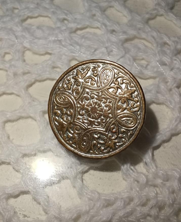 Эта пуговица не литая, а штампованная. В России этот метод изготовления пуговиц был внедрён в первой половине 19 века. Затем в конце 19 века появились пуговицы, при изготовлении которых в заготовке сверлили отверстие и вставляли ушко, потом одним ударом пресса выбивали лицевую и обратную сторону пуговицы. Но даже этот способ изготовления слишком древний для рассматриваемой нами пуговицы. Во второй половине 20 века появились двусоставные пуговицы, а в эпоху развитого социализма экономисты заставили производителей сделать технологический шаг назад и появились гнусные алюминиевые пуговицы, у которых ножка отваливается с одного щелчка. На мой взгляд Ваша пуговица появилась на следующем этапе в итоге развития правильной инженерной мысли в части повышения надёжности крепления ножки. Вот как этого добились. Ударом пресса по круглой заготовке выбивалась лицевая сторона с рельефными узорами рисунка и обратная сторона с рельефной площадкой. Затем к площадке крепились три кольца, и всё вместе спаивалось в единую конструкцию ушка и пуговицы. Три кольца вместо одного создают очень надёжное соединение, такое способны были придумать только современные инженеры. В итоге я бы предположил, что пуговица была изготовлена в 1970-80-х годах. Растительные мотивы изображения и отсутствие живых существ на первый взгляд отсылают нас к традициям восточного рисунка. Но это не так. Пуговица не имеет отношения к исламскому миру и эти растительные мотивы исключительно российские или в более широком смысле европейские. Всё разнообразие исламских растительных мотивов можно свести к зороастрийской первооснове и строгому соблюдению ее принципов. Как говорится, немного поскреби мусульманина, и там увидишь уструшанина. Действительно, на пуговице есть солнце, важный элемент зороастризма. Но зато отсутствуют другие, не менее важные элементы этого цельного культурного комплекса. Но ведь солнце не менее важный элемент в культуре славян, финно-угров и других народов.