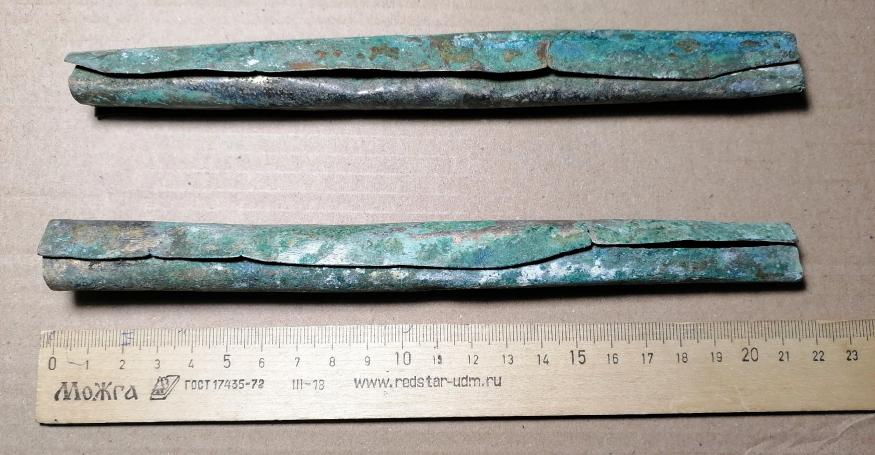 Здравствуйте, Уважаемые коллеги! Может кто знает , что это такое? Свернутые в трубочки бронзовые листы. Предполагаю, что были частью, элементом какого то оружия? Но вот какого и от чего именно? Внутри полые, легкие. Возможно касаются скифов или представителей Кобанской культуры.