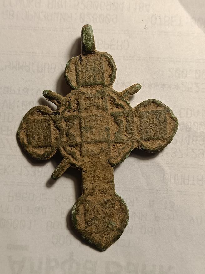 Крест тельник Время бытования: XVIII – XIX вв. Крест двухсторонний четырехконечный с сердцевидными концами, украшен белой эмалью. Средокрестие оформлено дугами, от которых отходят короткие прямые лучи. На лицевой стороне помещен контурный восьмиконечный Голгофский крест с цатой в средокрестии и Главой Адамовой в пещере. На верхней оконечности в квадратном фигурном медальоне – надпись ЦРЬ СЛА (Царь Славы) в две строки под титлами, на нижней оконечности, под Голгофой, в квадратном фигурном медальоне – монограмма МЛР АIБ (Место Лобное Рай Бысть) в две строки под титлами. На боковых оконечностях в таких же медальонах – монограммы ИС ХС под титлами. Все монограммы рельефные. Оглавие имеет вид плоского ушка. Обратная сторона орнаментирована, в средокрестии и оконечностях прямоугольные клейма с монограммами, составляющими текст: КРЕ СТУ ТВО ЕМУ ПОК ЛАН [ЯЕМСЯ] В ЛАД ЫКО. Данный тип крестов сформировался во второй половине XVII в. (в конце столетия они уже встречаются на русском Дальнем Востоке) и широко бытовал на территории России вплоть до XX в. Расцвечивание креста белой эмалью позволяет отнести данный экземпляр ко времени не позднее начала XVIII в. Кресты с сердцевидными оконечностями являются женскими. Судя по этнографическим коллекциям, их носили не только в качестве нательных, но и как наперсные. В последнем случае женщины прикрепляли их к концам низанных из бисера гайтанов ("хрестовок") и носили поверх одежды.
