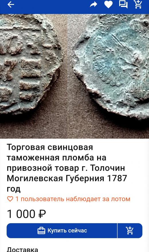 Здравствуйте, Александр! Это пломба с привозного товара, наложенная на сухопутной таможне Толочин в 1787 году. В прошлом Толочин был крупным таможенным пунктом Могилёвской губернии Российской империи.