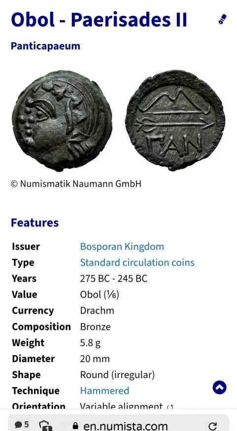 Боспорское царство, медный обол, Перисад 2, 275-245 гг. до н. э. Голова сатира влево, лук.