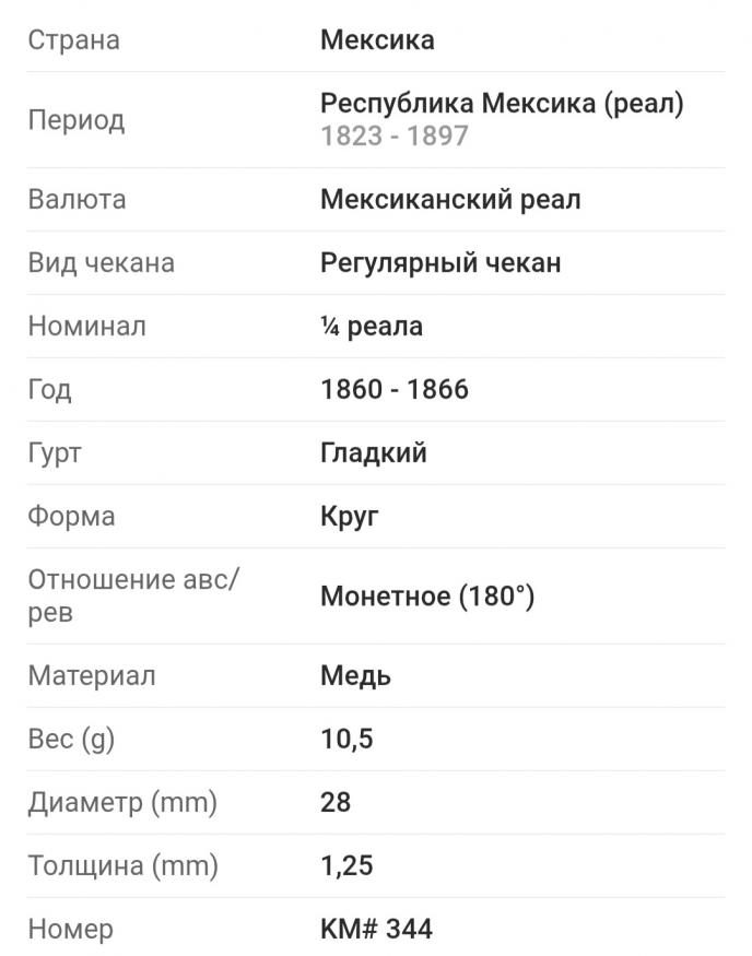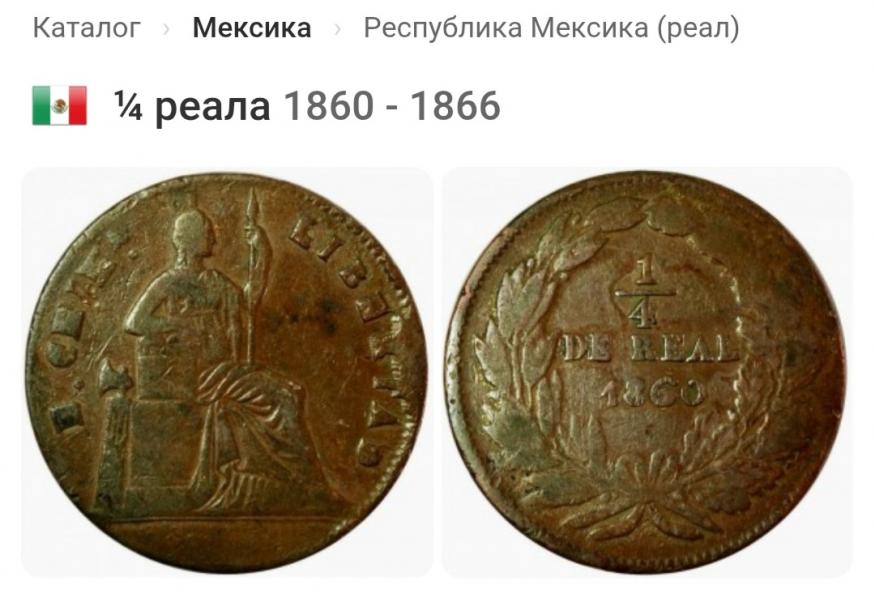 Здравствуйте. Монета Мексики 1/4 реала 1860 года. В начале 1860 года эти монеты чеканились в Чиуауа (штат на севере Мексики), также ешё известны с датами 1861, 1865 и 1866 года.