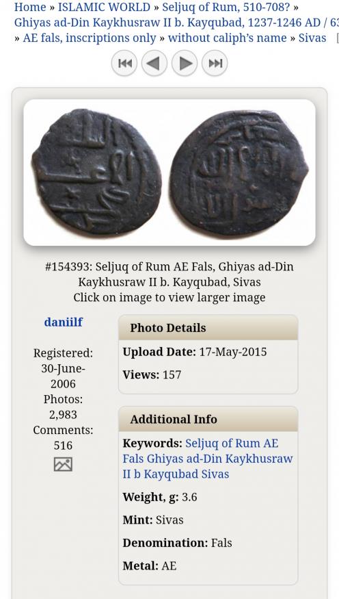 Нашел первую монету. Это медный фельс Сельджуков Рума (Конийского султаната). Султан Гийяс ад-Дин Кейхосров II бен Кейкубад, правил в 634-644 гг.х., или по нашему 1237-1246 гг. н.э. Монета выпущена на монетном дворе Сивас, без года выпуска. Весит монета тоже 3,6 г. На Зено номер монеты этого типа 154393.