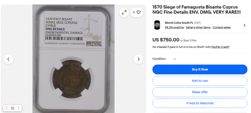 Здравствуйте, Уважаемые коллеги! Хотелось бы услышать ваше мнение по данной монете. А конкретно, что вы думаете о ее редкости и стоимости. Монета 1 бисанте (безант) г. Фамагуста, эта монета чеканилась в 1570-1571 годах в кипрском г. Фамагуста во время осады его турками. Монету чеканил командующий осажденными Марк Антоний Брагадин для оплаты обороняющимся войскам, обещая впоследствии выкуп монет золотом. Ваше мнение? С Уважением!