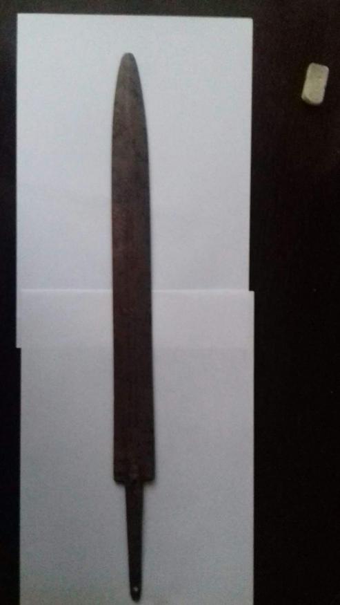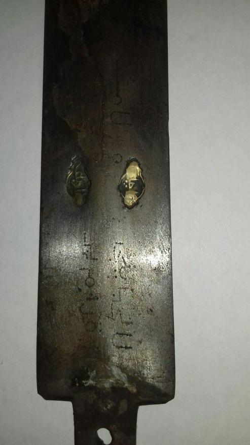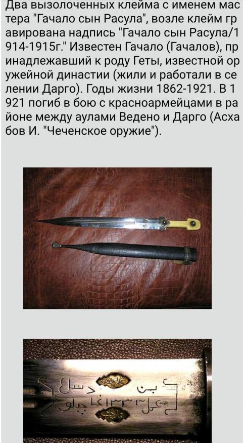 Здравствуйте.Чеченский клинок из Дарго. Два парных клейма в виде кувшина, с латунными вставками, на них выбивалось имя мастера. На Вашем:"Гачало сын Расула"(нужно прочитать надпись рядом с клеймами).