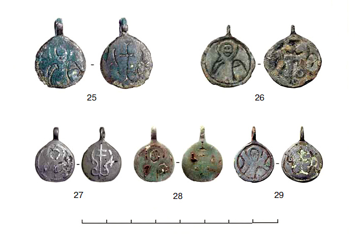 Иконки-привески с изображением Господа Вседержителя, вошедшие в Каталог, (табл. I, 6–16; II, 17–24; III, 25–33) чаще всего имеют круглую форму, реже – прямоугольную, киотчатую и арочную формы. В подавляющем большинстве случаев они относятся к домонгольскому времени, в том числе уникальная рельефно-ажурная иконка XI–XII вв. (табл. I, 16), и найдены, за некоторыми исключениями, в пределах исторической территории Киевской Руси.