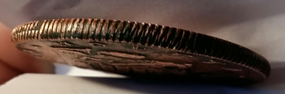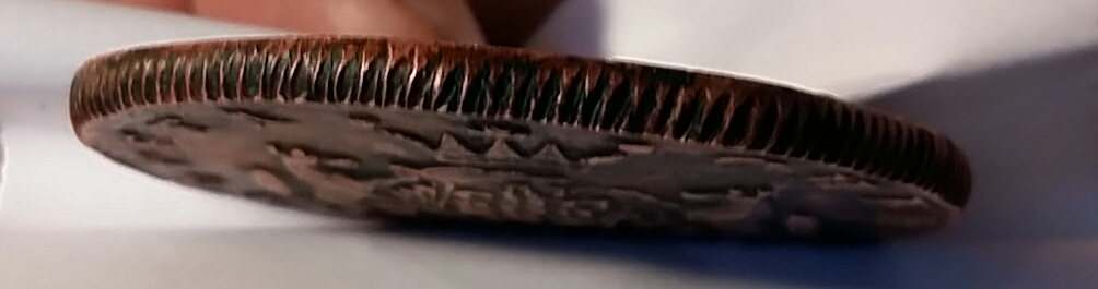 Мне совершенно не нравится монета (даже учитывая, что она якобы в копаной "зелёнке"). Особенно мне не нравится гурт, колоски на реверсе, совершенная НЕстёртость короны при затёртом вензеле и т.д.